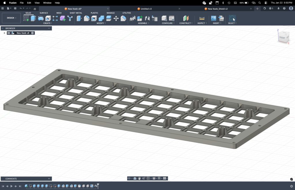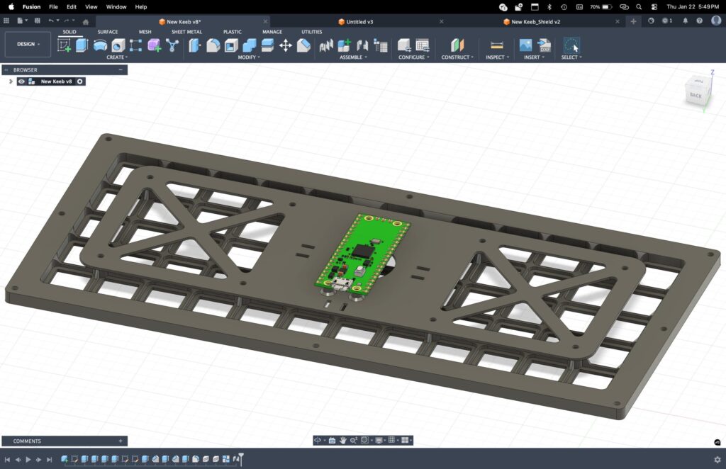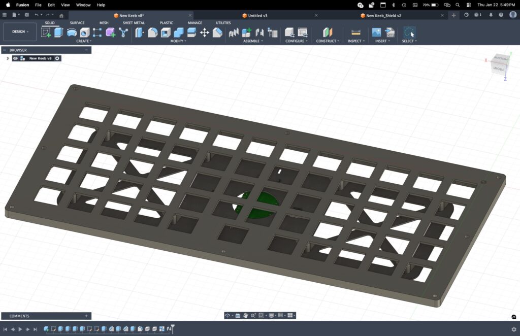 From there, the DXF got imported into Fusion, where I modeled the final plate geometry around it. Thickness, mounting points, tolerances, and how it integrates with the rest of the chassis all happened at this stage. Using this workflow saved a ton of time and avoided the usual guesswork of lining up switches by hand in CAD. The plate is accurate because it’s driven directly from the layout.