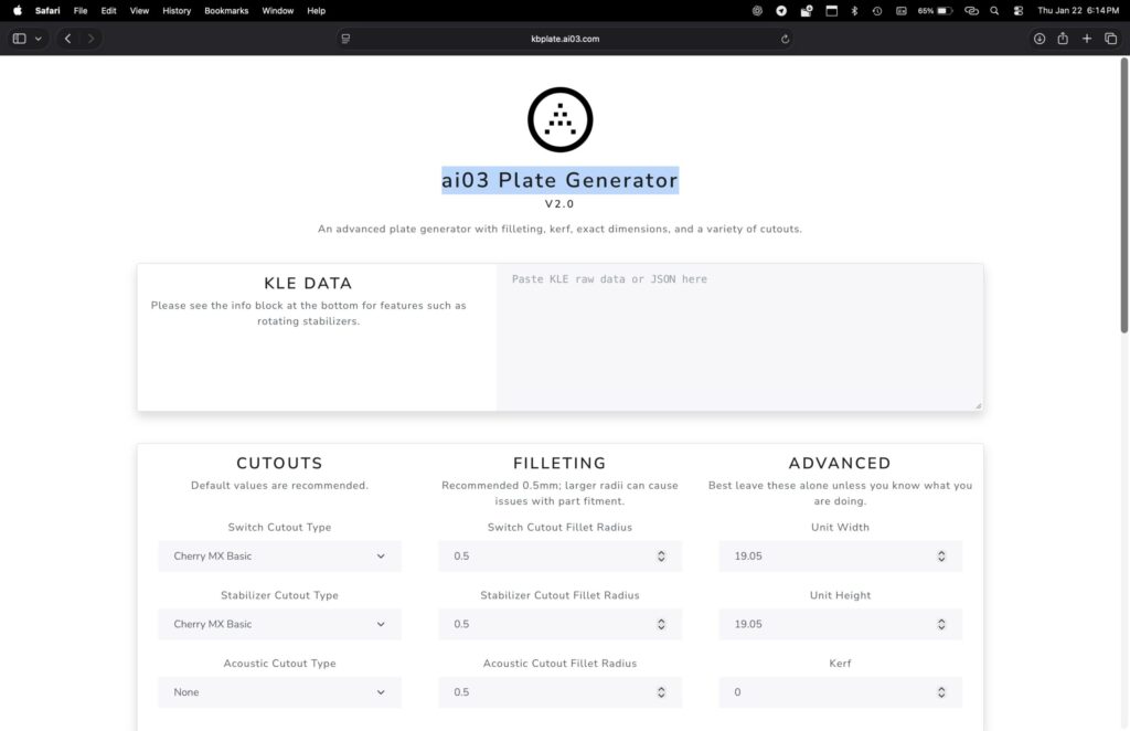 The keyboard plate itself is fully custom and 3D printed. I didn’t want to design the layout blindly in CAD, so I started where most keyboard people do: Keyboard Layout Editor. I mocked up the exact layout there until the spacing and ergonomics felt right (well, really it just needed to match the keycaps), then exported the raw JSON data. That JSON went straight into ai03’s Plate Generator, which turned it into a DXF file for the plate cutout.